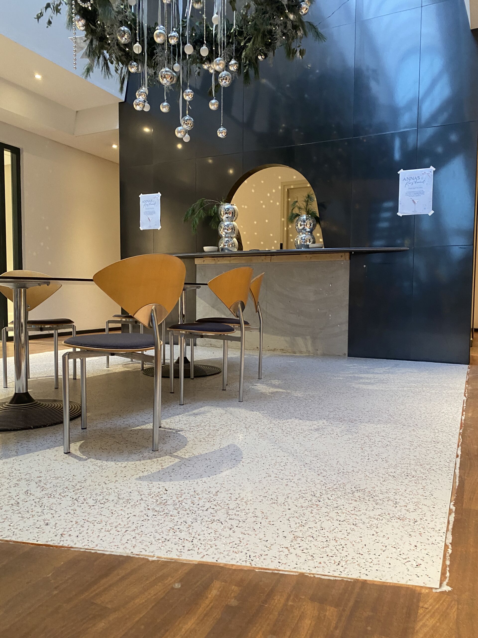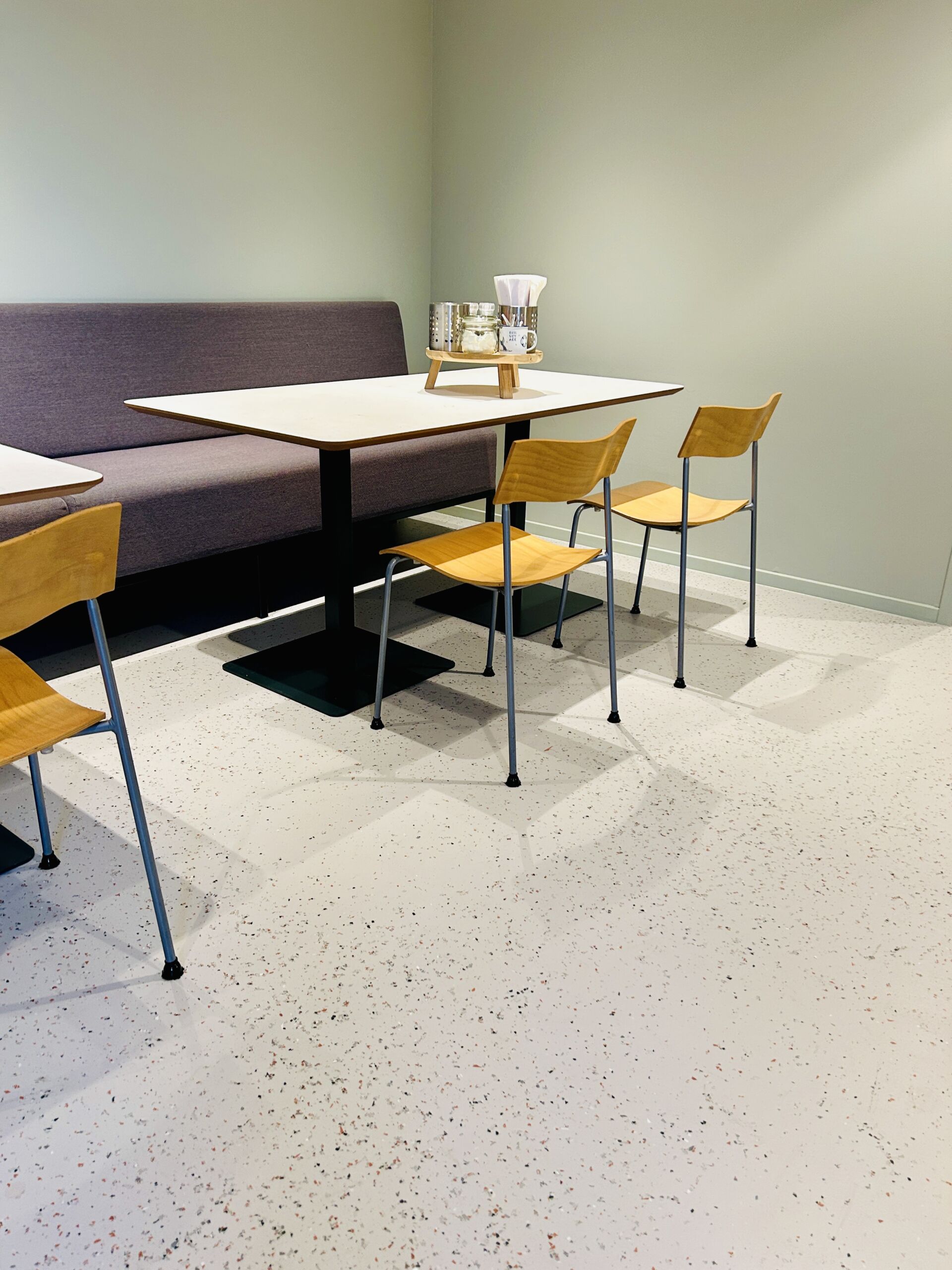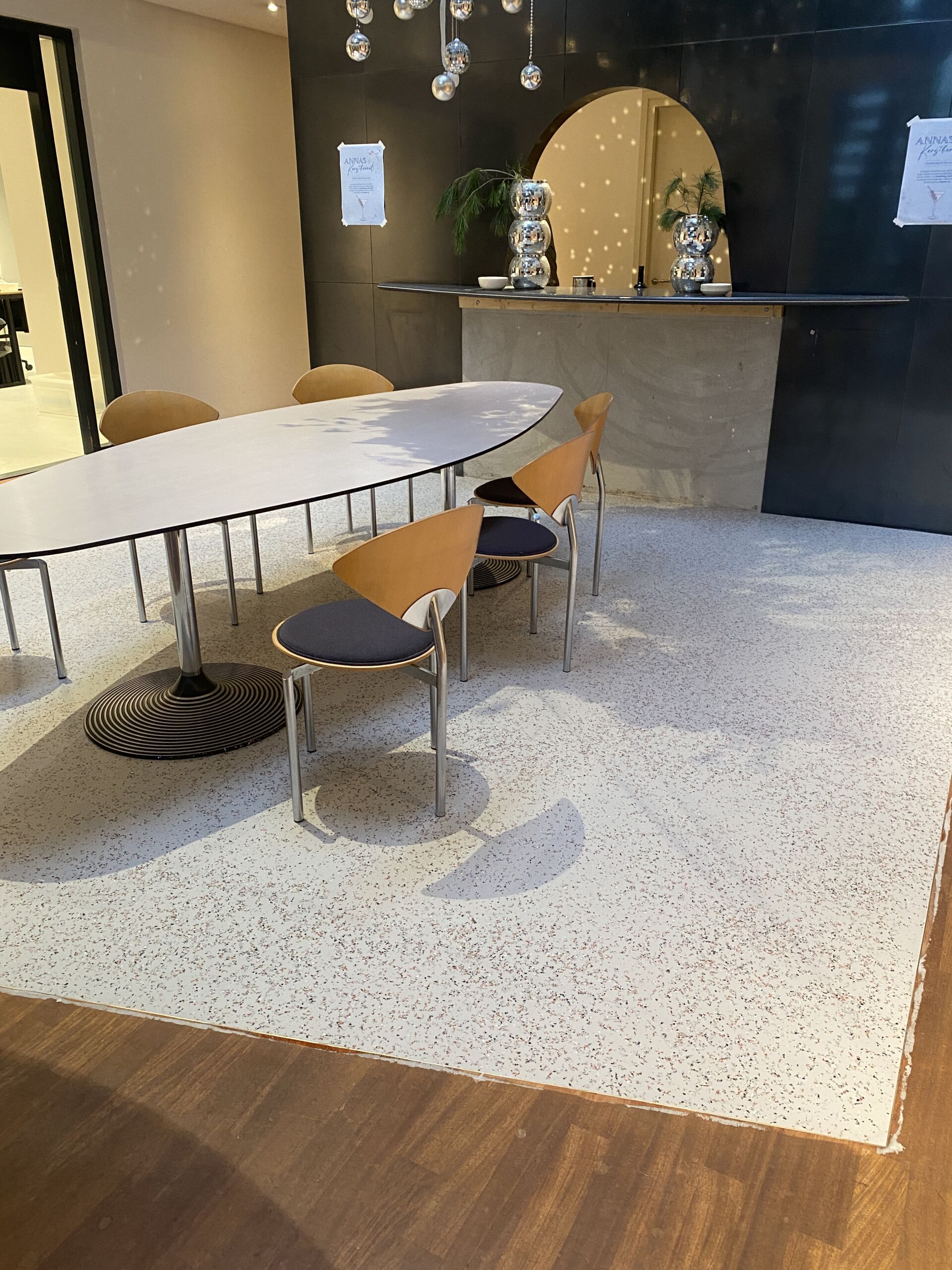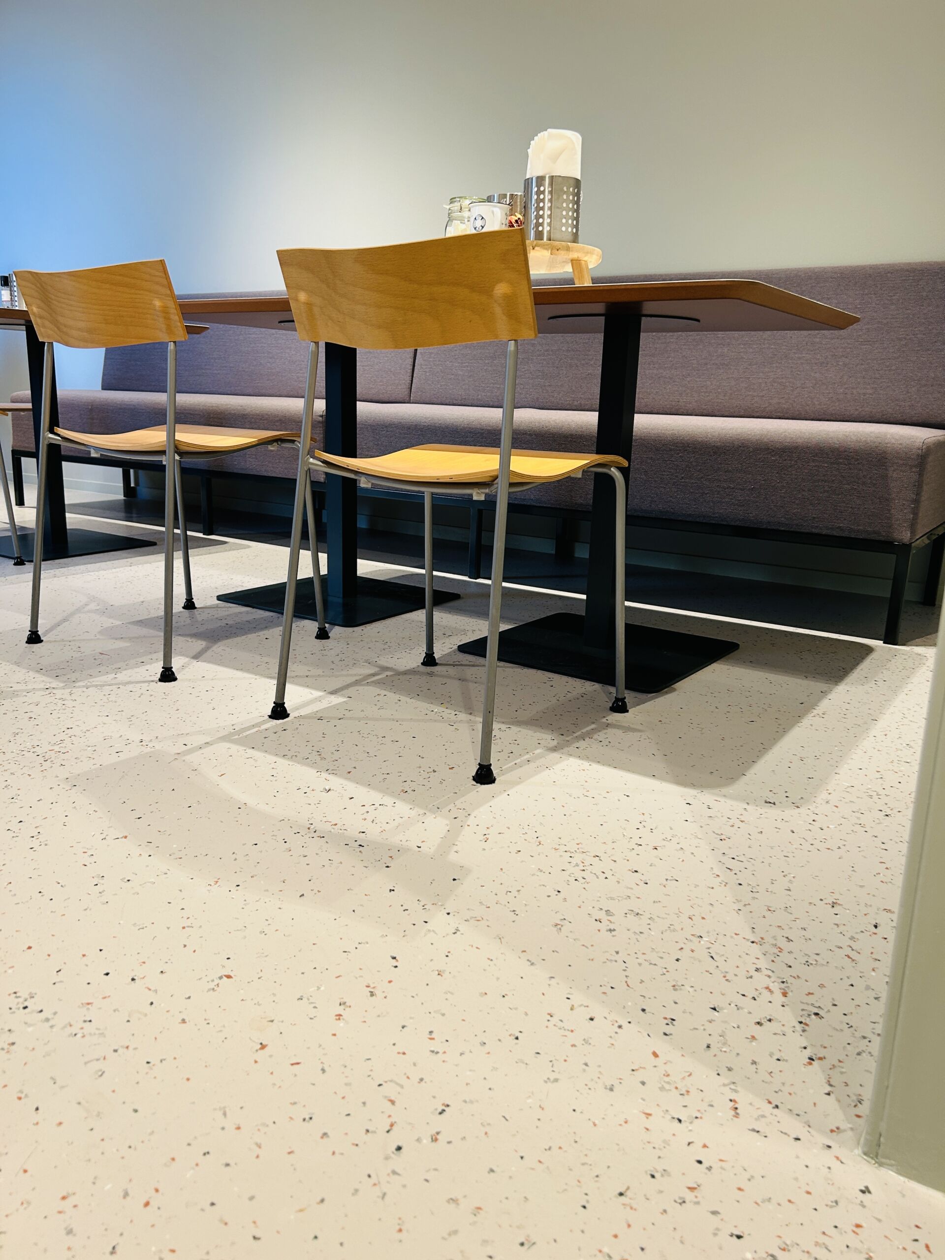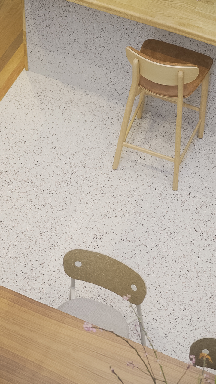 De op maat gemaakte recycled terrazzo vloer van The Good Floor en The Good Wall vormen de basis van het interieur. Gemaakt van hergebruikte materialen en afgestemd op de ruimte, zorgt de vloer voor een rustige en hoogwaardige uitstraling.