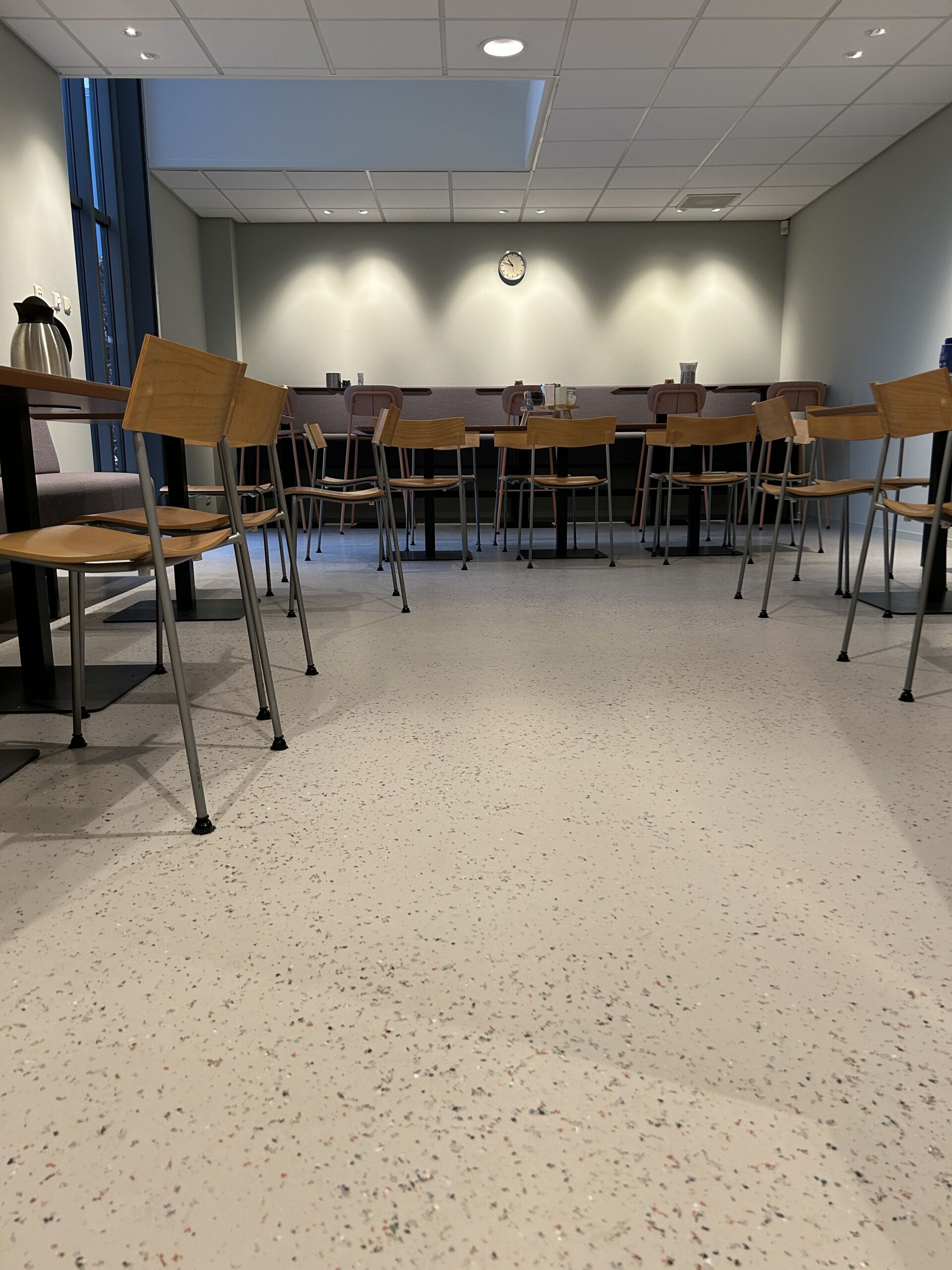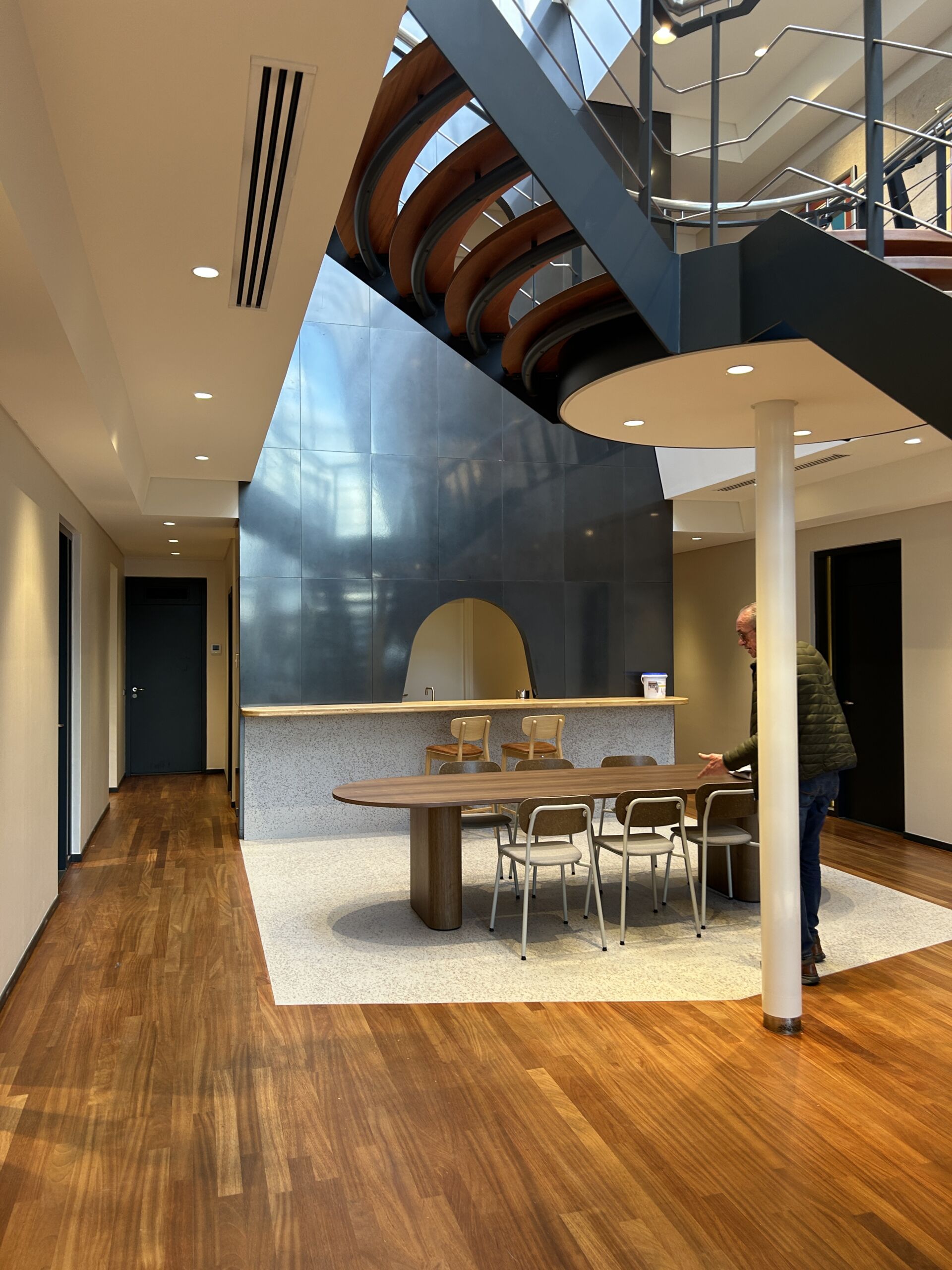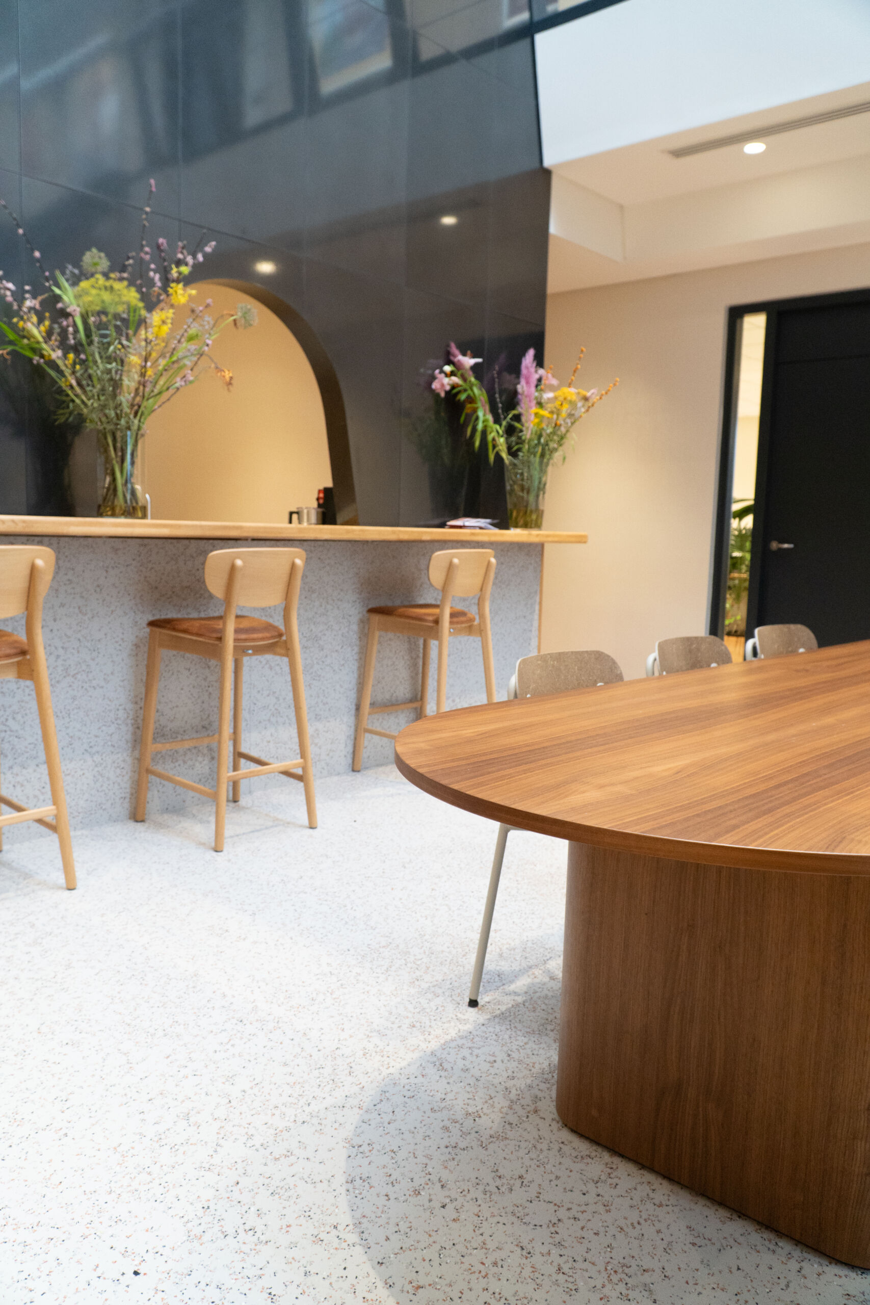 De recyled terrazzo vloer en wandafwerking verbindt verschillende zones binnen het HQ en geeft het interieur een rustige, hoogwaardige uitstraling die perfect aansluit bij de identiteit van Anna van Toor