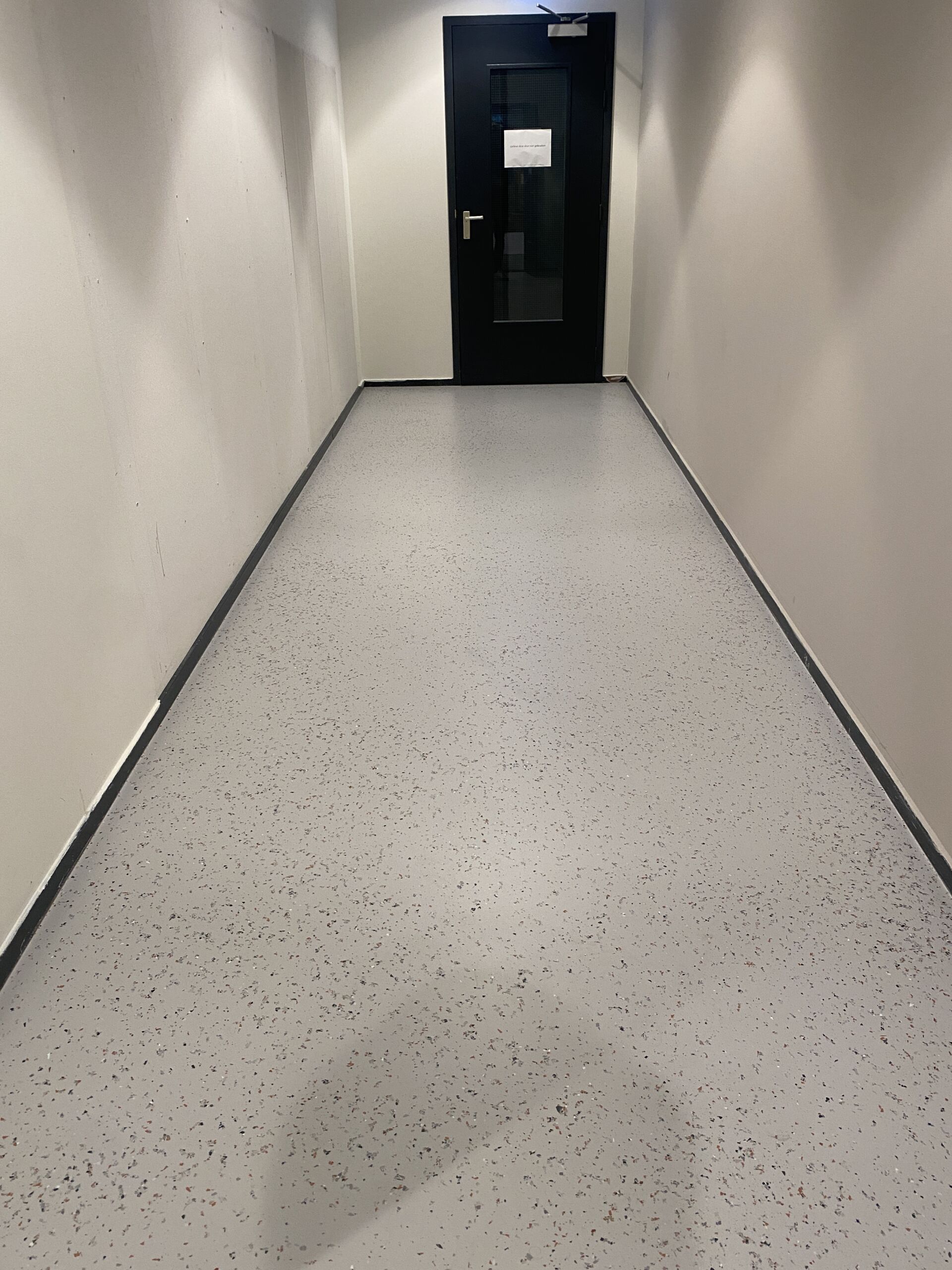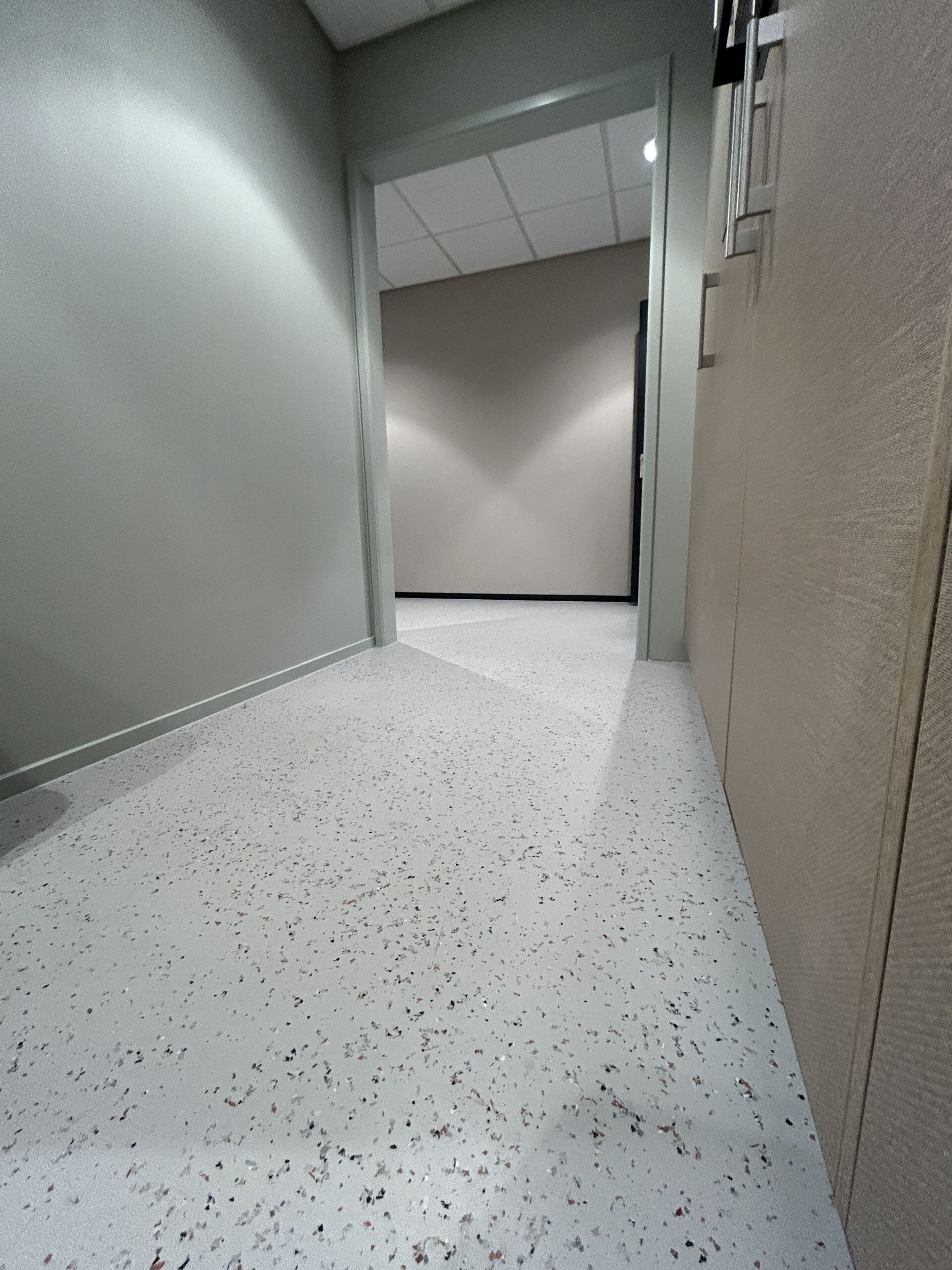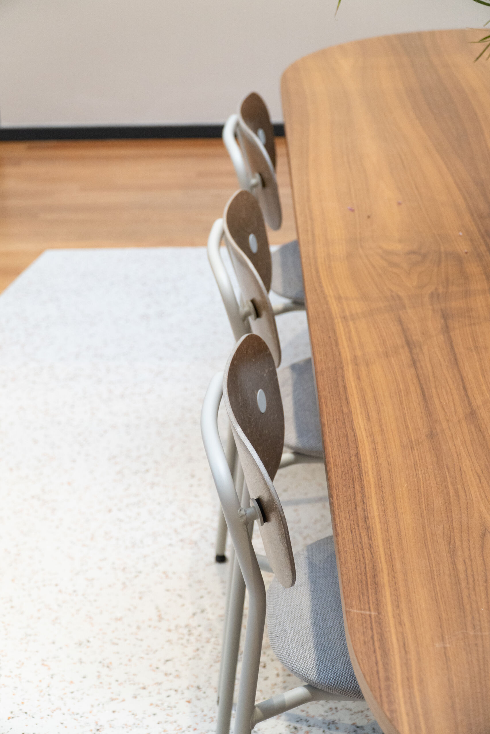 De recyled terrazzo vloer en wandafwerking verbindt verschillende zones binnen het HQ en geeft het interieur een rustige, hoogwaardige uitstraling die perfect aansluit bij de identiteit van Anna van Toor
