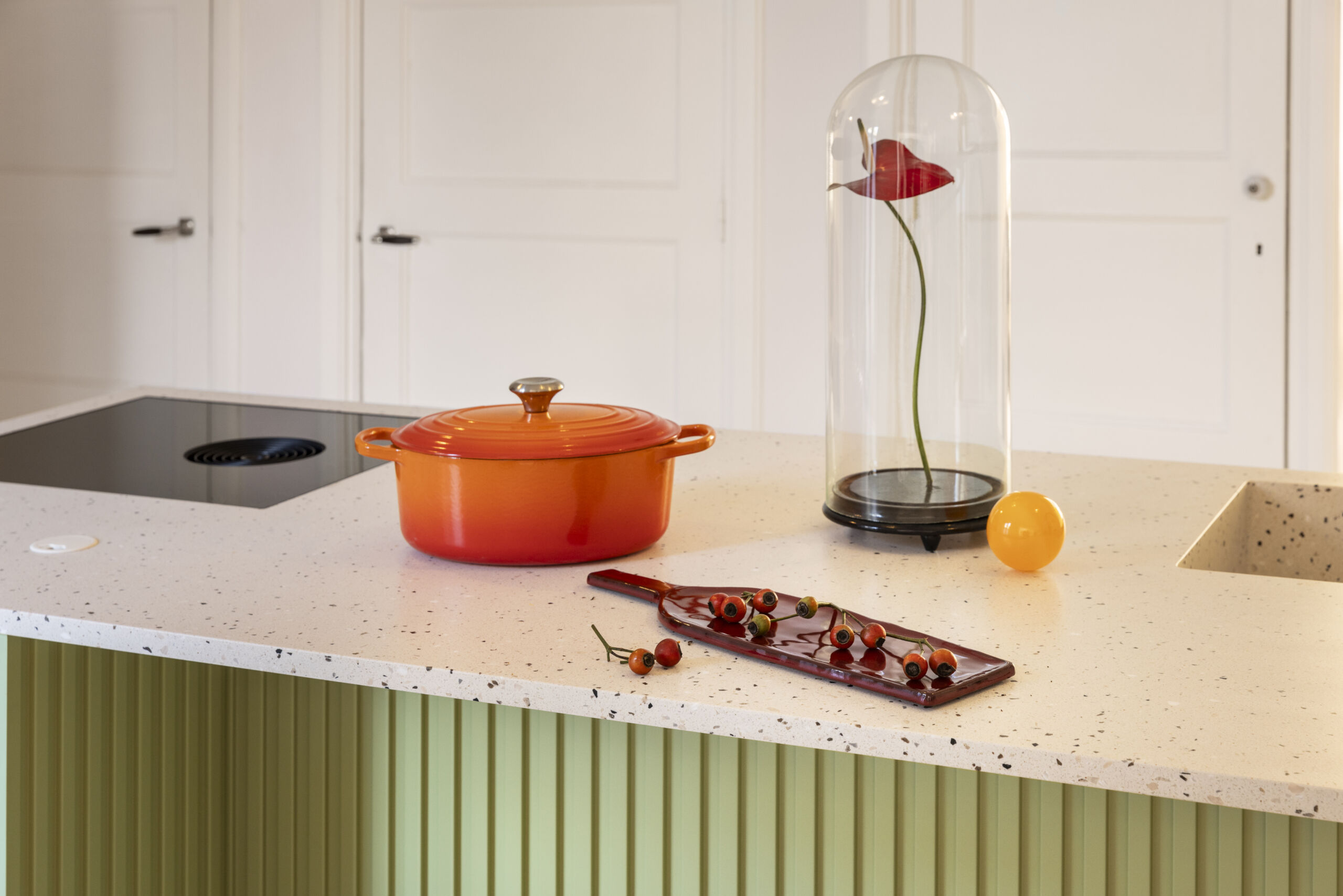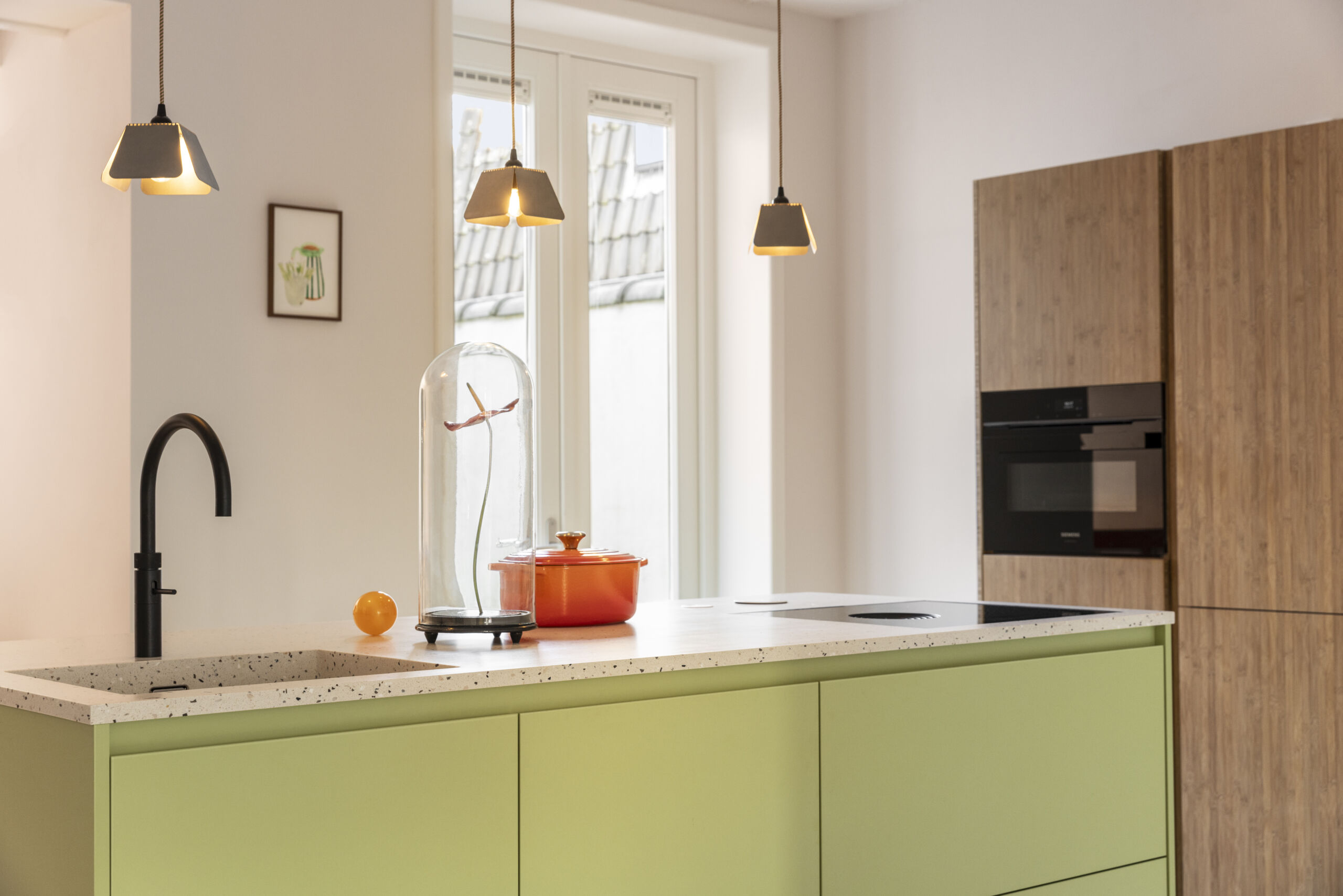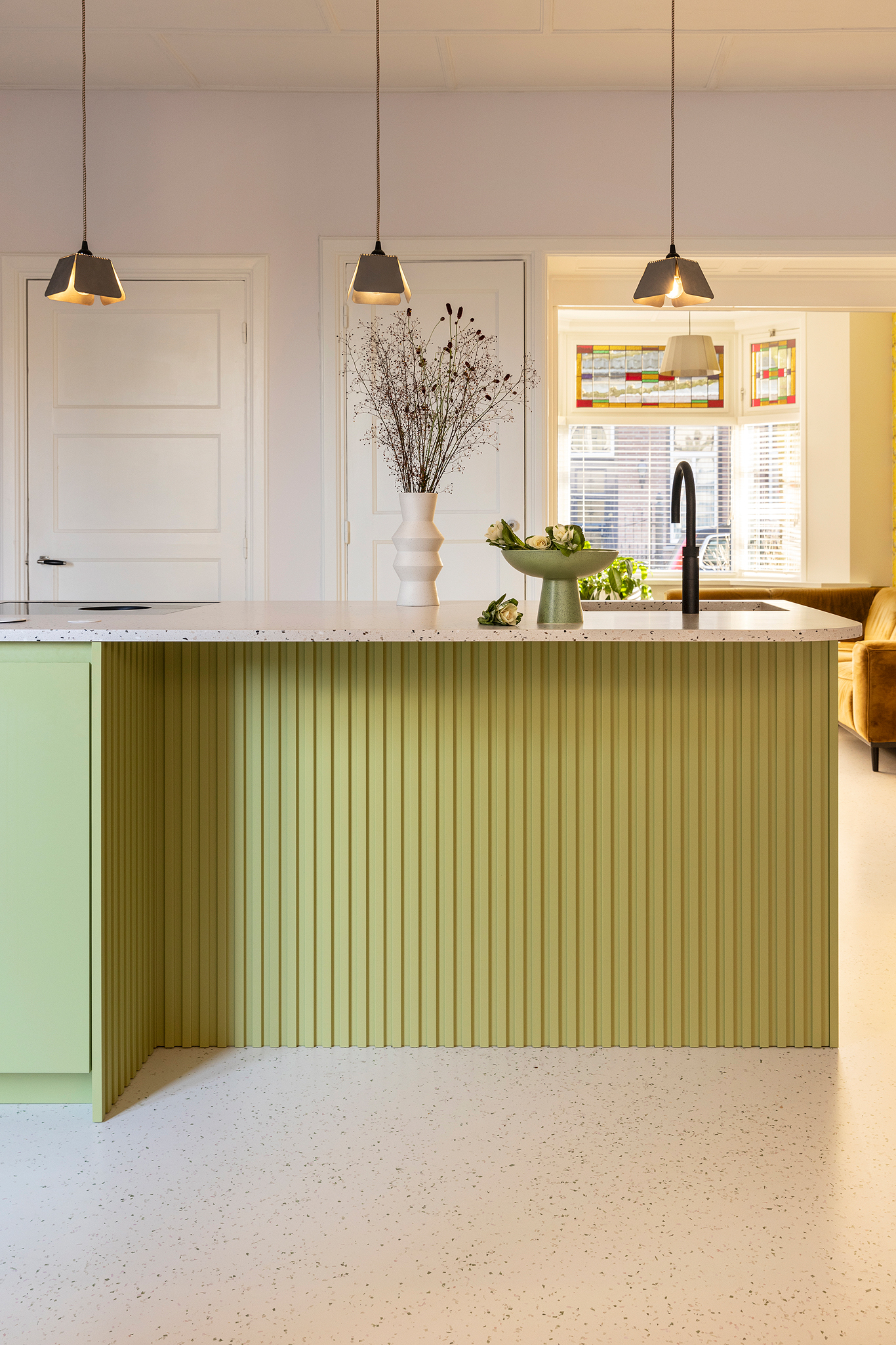 A beautifully refreshing design assembled by the client. Both the handmade kitchen from Houtwerff and the artisanal recycled terrazzo from The Good Floor really stand out. The colors pink and green give it a sparkling yet vintage ‘vibe’. In short… A kitchen with a touch of retro that combines beautifully with the special floor from The Good Floor.
